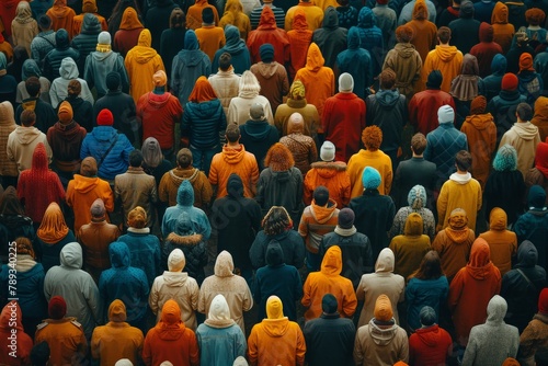 A burst of color fills the frame as an assembly of people is viewed from the back, all in cold-weather attire indicating a communal outdoor event