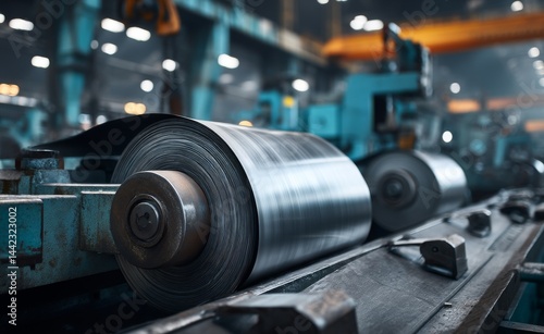 A business concept is illustrated by a machine that produces metal coils, situated in the interior of a factory