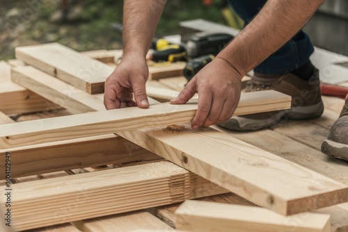 A carpenter assembling wooden planks for a construction project outdoors