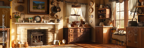 A charming country cottage, complete with a cozy fireplace, quaint kitchen, and a collection of knickknacks on an old dresser.