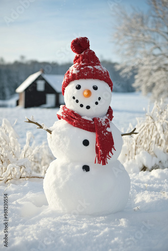 a charming snowman stand on the farm village while snow flies