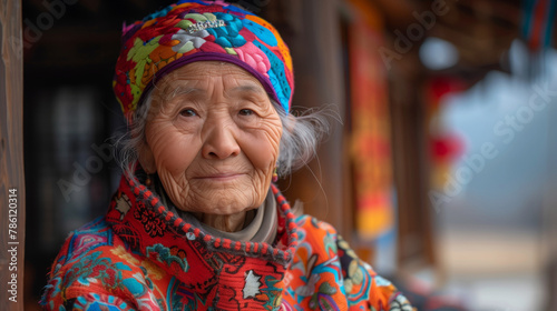 A Chinese old woman with a colorful hat and a red and white jacket. She is smiling and looking at the camera. A kind Chinese old lady with a kind smile