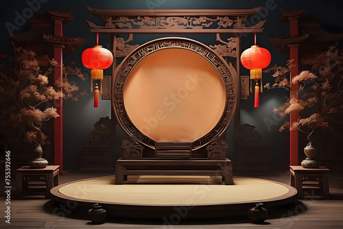 A Chinese podium with a picture of a dragon and a space in the middle is decorated with hanging Chinese lanterns.