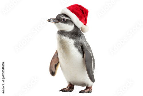 A Christmas penguin wearing a Santa hat, isolated on a transparent background.