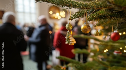 A Christmas tree with decorations and blurred people in the office party background