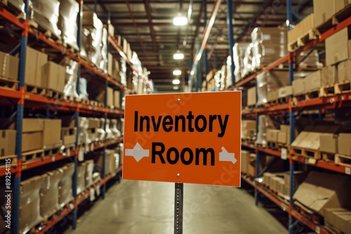 A clear sign stating "Inventory Room" positioned at the entrance of a storage area within the warehouse, surrounded by shelves and boxes