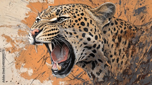 A close up of a leopard's face with its mouth open. A leopard with a fierce expression