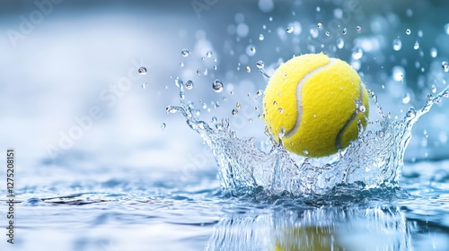A Close-Up of a Bouncing Yellow Tennis Ball Creating Splashes in Bright Blue Water Under a Clear Sky, Capturing the Joy of Sports and Movement