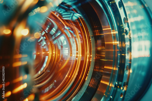 A close-up of a cinema lens, with its multiple glass elements and aperture blades separated and casting cinematic light patterns,
