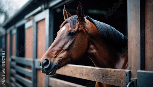 A close-up of a horse's head looking out from a stable with wooden walls.