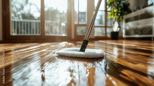 A close-up of a mop cleaning a shiny, polished wooden floor glistening under the warm sunlight streaming through large windows, emphasizing cleanliness and comfort.