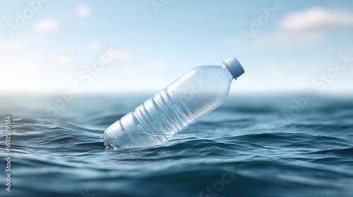 A close-up of a plastic bottle floating on the ocean surface, symbolizing the global plastic pollution crisis.