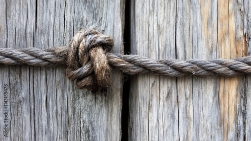 A close-up of a tightly tied rope knot against a backdrop of weathered wooden planks, showcasing craftsmanship and connection.