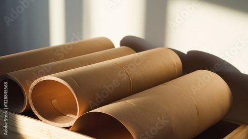 A close-up of rolled kraft paper in warm sunlight, showcasing their texture and natural color tones, creating a serene and artistic atmosphere.