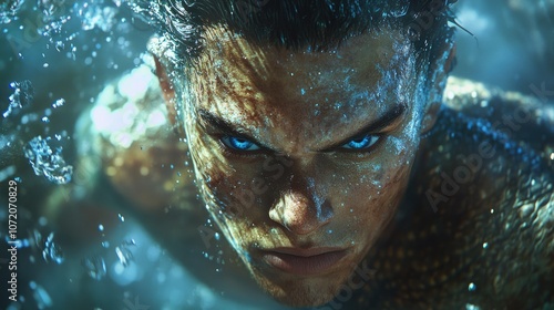 A close-up portrait of a man with blue eyes and wet skin looking intensely at the camera.