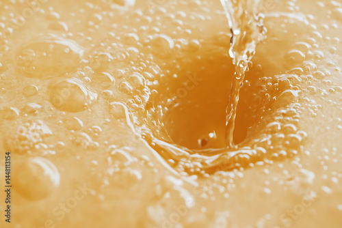 A close-up shot shows a stream of liquid pouring into a pool, creating ripples and bubbles. The warm, golden hue suggests a refreshing beverage or flavorful sauce.