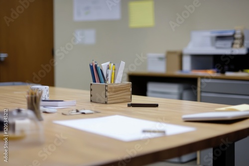 A close-up view of a wooden desk covered in various office supplies, including pens, pencils, papers and more