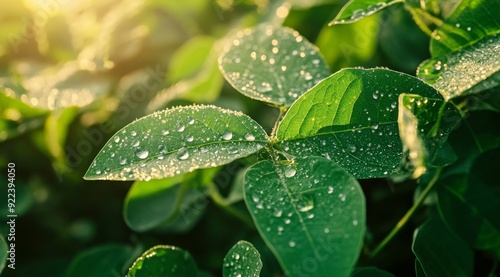 A closeup view of lush and vibrant soybean leaves, adorned beautifully with glistening morning dew, perfectly capturing the essence of natures incredible beauty and its profound serenity