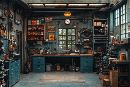 A cluttered workshop with a workbench, shelves, tools, and a window overlooking greenery.