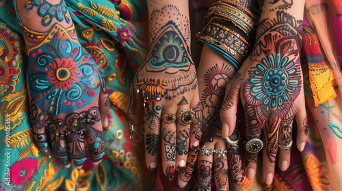 A collage showcasing the popularity of temporary tattoos applied to women's hands in colorful ethnic patterns against a vibrant background