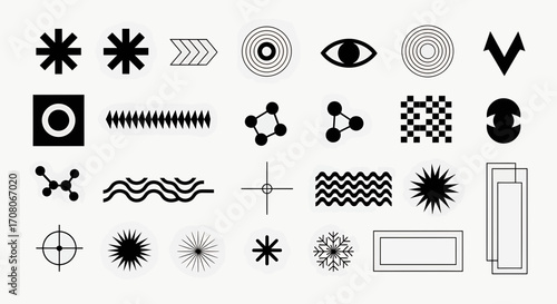 A collection of abstract geometric shapes and symbols, including stars, eyes, waves, and molecular structures, isolated on a