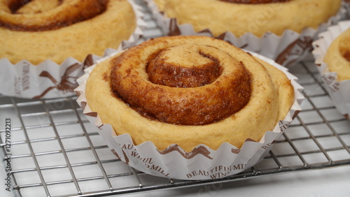 A collection of cinnamon rolls using paper cups and placed on a cooling rack with a white background (isolated white).