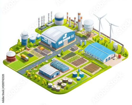 A colorful illustration of a modern agricultural facility featuring greenhouses, wind turbines, silos, and various crops, showcasing sustainable farming practices.