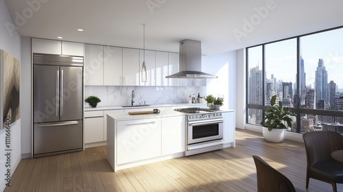 A contemporary kitchen featuring white cabinetry, stainless steel appliances, and clean lines, creating a bright and functional cooking environment