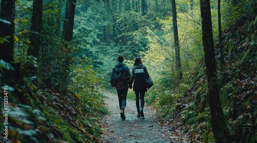 A couple walking through a forest trail, exploring nature and connecting with each other in a healthy lifestyle.