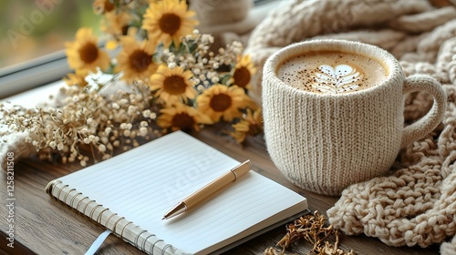 A cozy and inviting flat lay scene showcasing a minimalist workspace with a coffee cup notebook and pen arranged on a clean desk surface