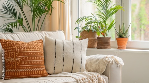 A cozy bohemian living room with eclectic decor and abundant plants.