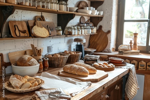 A cozy kitchen counter overflowing with a variety of freshly baked bread loaves and rolls. Generative AI