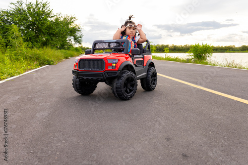 A cute little Asian girl is having fun driving a toy car on a concrete road.