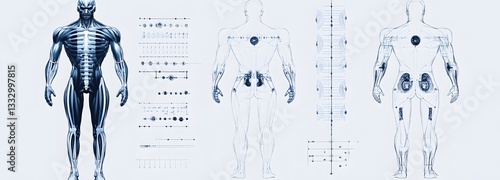 A cybernetic humanoid blueprint, showcasing biomechanical muscles, neural connections, and a power core.