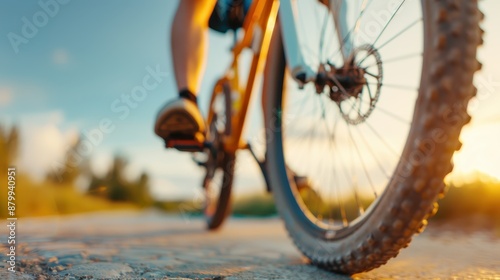 A cyclist captured mid-ride on a scenic trail bathed in warm sunlight, evoking a sense of freedom and adventure amidst the natural landscape.