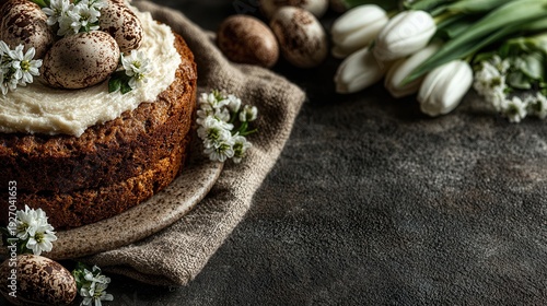 A decorated cake topped with eggs and fresh flowers sits on a wooden table, showcasing rustic spring-themed dessert styling in natural daylight.