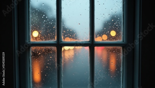 A delicate, soft-focused image of a windowpane, with rain droplets gently streaking down the glass, casting a misty veil over the blurred, shimmering city lights in the background, which seem to pulse