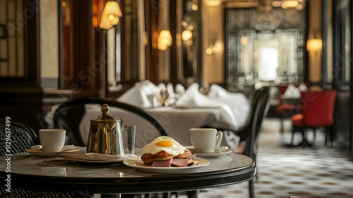 A delicious eggs benedict with ham, poached eggs, and hollandaise sauce served in an elegant restaurant setting -