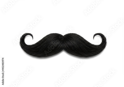 A detailed close up of a black handlebar mustache on a white background with curled ends and texture