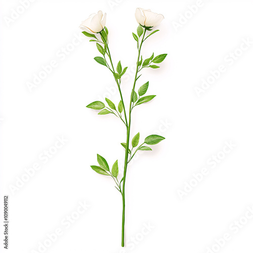 A detailed view of a white rose stem showcasing its delicate beauty. On white background