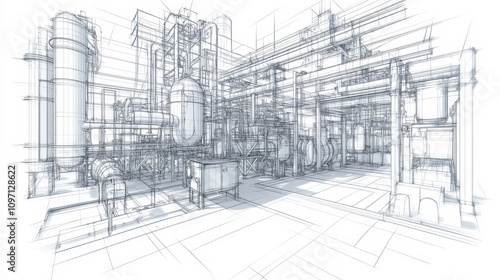 A detailed wireframe sketch of industrial equipment, showcasing both visible and invisible line layers, emphasizing structural components and mechanical elements in a layered design.
