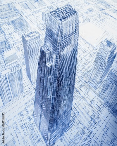 A digital illustration of a tall skyscraper among city structures, showcasing architectural design.