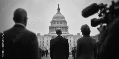 A distinguished government officials in front of the building. The image shows a moment of solemnity. With professional camera and microphone capturing the scene