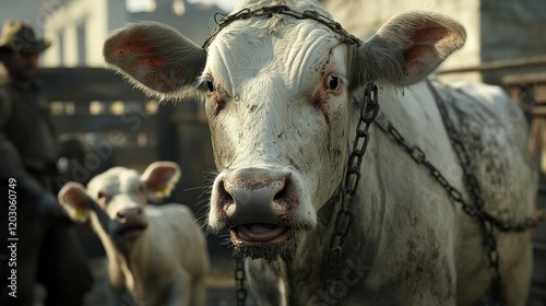 A distressed dairy cow with a broken chain around her neck, crying and chasing after her calf being led away by a worker