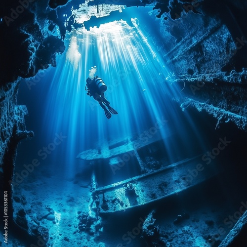 A diver descending into the depths of the ocean, surrounded by beams of sunlight streaming through the water, creating a mystical and serene atmosphere