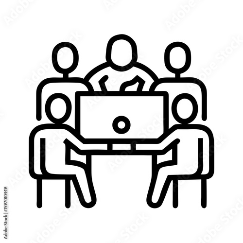 A diverse group of people collaborates around a table with a computer during a business meeting