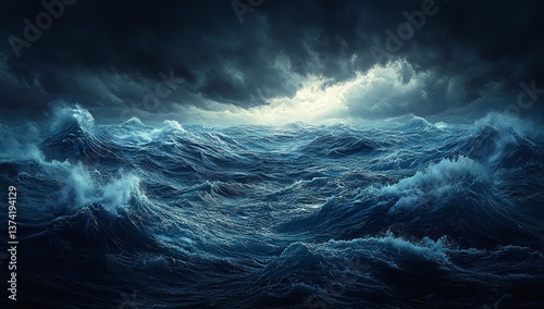 A dramatic depiction of a stormy sea under a dark, brooding sky. The powerful waves and turbulent waters create a sense of awe and intensity.