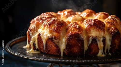 A dramatic lighting shot of monkey bread with cheese melting down its sides, highlighted by moody shadows
