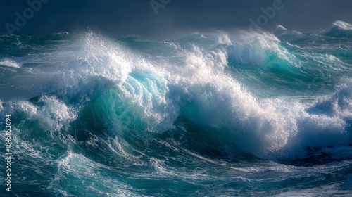 A dramatic ocean scene capturing a wave cresting, showing its power and the interplay of light and water. Dramatic skies