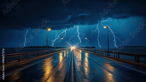 A dramatic storm scene with lightning illuminating a wet road and dark clouds overhead.